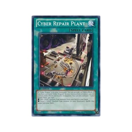 Card Text: If "Cyber Dragon" is in your Graveyard: Activate 1 of these effects. If there are 3 or more "Cyber Dragons" in your Graveyard, you can activate both of these effects, and resolve in sequence. You can only activate 1 "Cyber Repair Plant" per turn. ? Add 1 LIGHT Machine-Type monster from your Deck to your hand. ? Target 1 LIGHT Machine-Type monster in your Graveyard; shuffle that target into the Deck.
