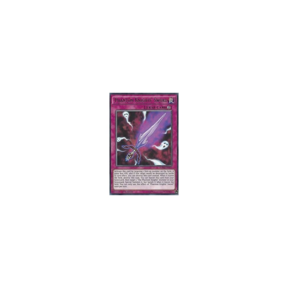 Card Text: Activate this card by targeting 1 face-up monster on the field; it gains 800 ATK, also if that target would be destroyed by battle or card effect, you can destroy this card instead. When it leaves the field, destroy this card. You can banish this card from your Graveyard, then target 1 "The Phantom Knights" monster in your Graveyard; Special Summon it, but banish it when it leaves the field. You can only use this effect of "Phantom Knights' Sword" once per turn.