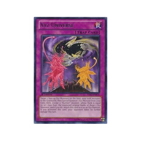 Card Text: Target 2 face-up Xyz Monsters on the field; send those monsters to the Graveyard then Special Summon from your Extra Deck 1 Xyz Monster except a "Number" monster whose Rank is equal to or 1 less than the total Ranks of the sent monsters and if you do attach this card to it as an Xyz Material. If you activate this card your opponent takes no damage for the rest of this turn.