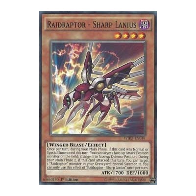 Card Text: Once per turn, during your Main Phase, if this card was Normal or Special Summoned this turn: You can target 1 face-up Attack Position monster on the field; change it to face-up Defense Position. During your Main Phase 2, if this card attacked this turn: You can target 1 "Raidraptor" monster in your Graveyard; Special Summon it. You can only use this effect of "Raidraptor - Sharp Lanius" once per turn.
